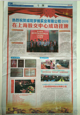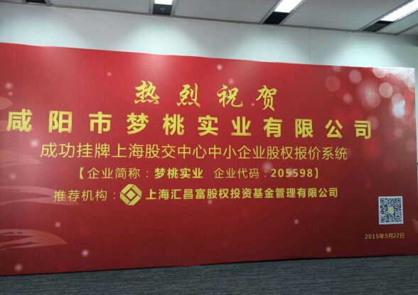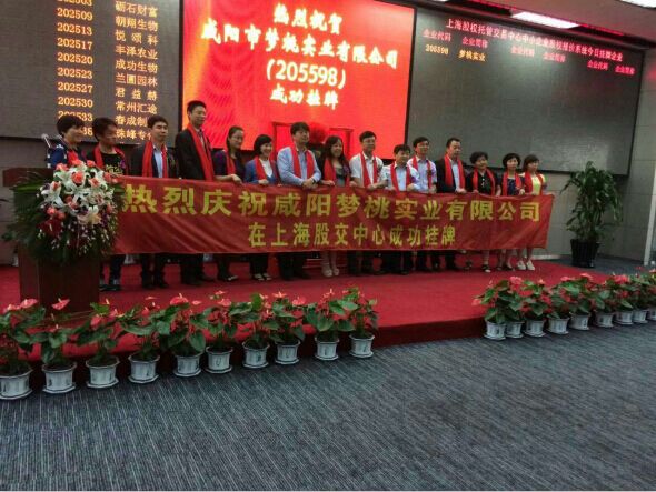 在咸陽市金融辦的具體指導下,咸陽夢桃實業有限公司專門組織精英團隊,查閱大量資料,深入探索研究,多渠道吸收經驗。經過長時間不懈努力,于2015年4月24日收到了上海股權交易托管中心發布的《關于同意咸陽夢桃實業有限公司掛牌的通知》(滬股交【2015】1893號文件)。2015年5月22日,咸陽市市政府副秘書長、市金融辦主任張榮輝為公司掛牌上市儀式敲響了第一鑼。至此,咸陽夢桃實業有限公司成為第一家咸陽民營企業在上海股交中心正式掛牌上市的企業。